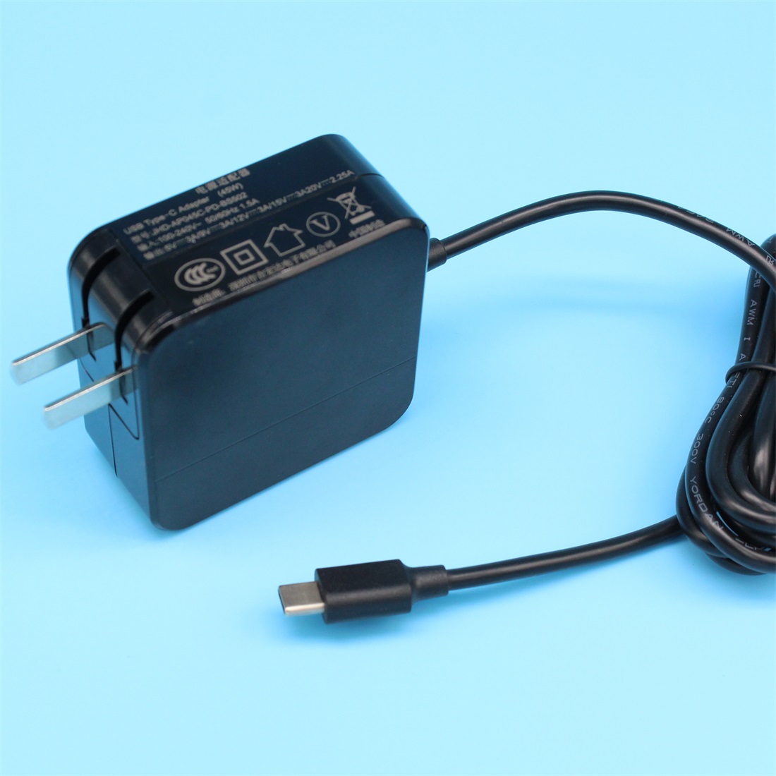 中规3C认证折叠插脚45W TYPE-C电源适配器,PD快速充电器,USBC电源适配器,型号:JHD-AP045C-PD-BS502,认证:CCC,UL,FCC,CE,PSE,DOE,ROHS,产品描述:CCC认证45W PD快速充电器,PD电源适配器。45W USB-C充电器多达5组输出电压模式,5V3A,9V3A,12V3A,15V3A,20V2.25A任意组合,可以按客户要求定制,可以定制其它输出电压。