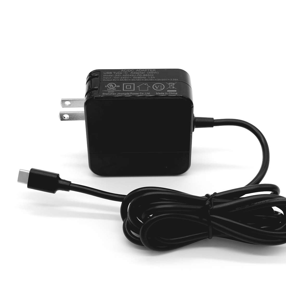 UL美规USB TYPE-C充电器,型号:JHD-AP045U-PD-CS502, 输出:5V3A,9V3A,12V3A,15V3A,20V2.25A。通过UL,FCC,PSE,CCC,CE,VI,ROHS等认证;美规UL,FCC认证45W-PD充电器,USB-C快速充电器,45W USB Power Delivery快充协议充电器。